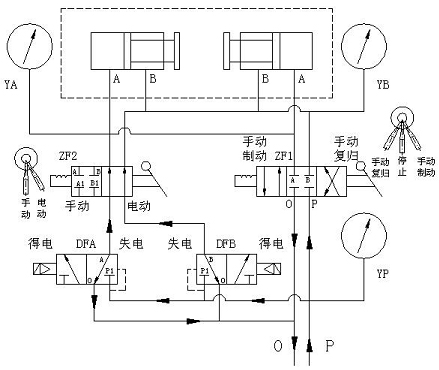 2、手動回路:將手動轉(zhuǎn)閥ZF2的手柄扳到手動位置。壓縮空氣密封在手動轉(zhuǎn)閥ZF1的壓力腔內(nèi)。